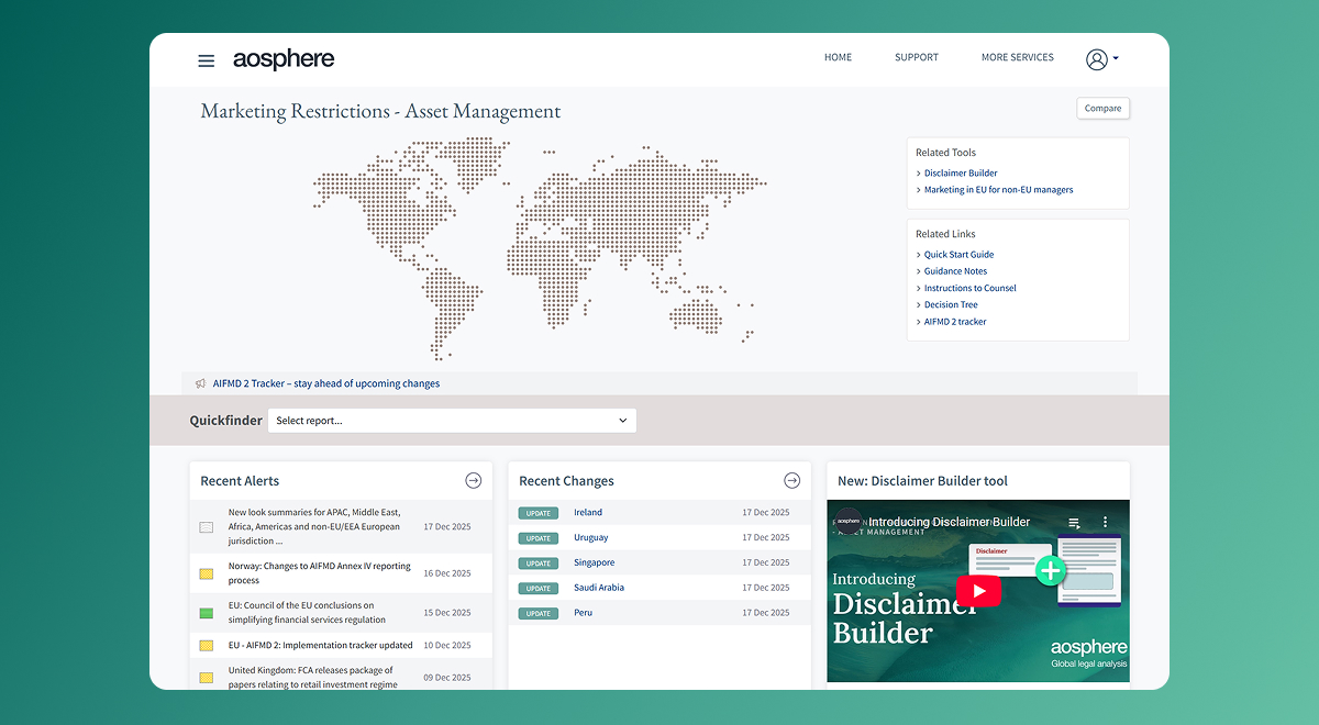Our dedicated team of senior lawyers works with leading local counsel to deliver all the information you need for cross-border distribution. Content is organised in a clear, granular structure so you can quickly find guidance by product, service, and type of activity.